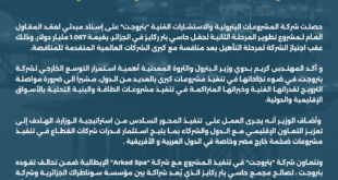 حصلت شركة المشروعات البترولية والاستشارات الفنية “بتروجت” على إسناد مبدئي لعقد المقاول العام لمشروع تطوير المرحلة الثانية لحقل حاسي بئر ركايز في الجزائر، بقيمة 1.087 مليار دولار، وذلك عقب اجتياز الشركة لمرحلة التأهيل بعد منافسة مع كبرى الشركات العالمية المتقدمة للمناقصة. و أكد المهندس كريم بدوي وزير البترول والثروة المعدنية أهمية استمرار التوسع الخارجي لشركة بتروجت، في ضوء …