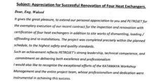 وجهت شركة بتروجلف خطاب شكر وتقدير إلى شركة بتروجت عقب نجاحها في تنفيذ أعمال الإصلاح والتصديق على أربعة مبادلات حرارية، إلى جانب عمليات الفك والتحميل والتفريغ والتركيب، وذلك وفقاً للجدول الزمني المحدد وبأعلى مستويات الدقة والجودة. وأكدت الرسالة التقديرية التزام فريق العمل بتطبيق معايير السلامة والصحة المهنية في جميع المراحل، مشيدةً بما أظهرته ورش بتروجت المركزية بالقطامية من مهنية عالية …