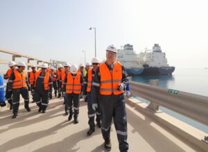 استهل الوزير الزيارة بتفقد الرصيف البحرى الذى ترسو عليه حالياً السفينة هوج جاليون حيث اطمئن على سير العمل وعمليات تفريغ الغاز الطبيعي المسال للسفينة وإعادة تحويله للحالة الغازية ومن ثم ضخه فى الشبكة القومية للغازات .