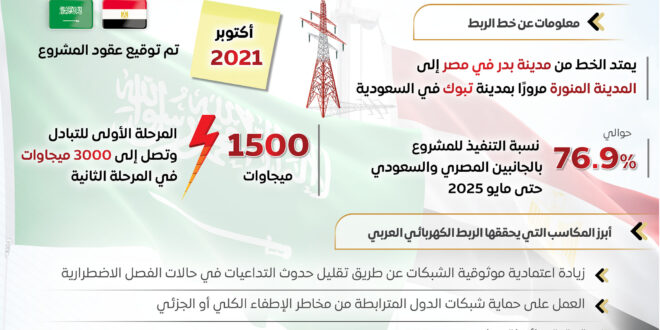 وأوضحت الإنفوجرافات أن الربط الكهربائي المصري السعودي بمثابة خطوة استراتيجية نحو شبكة عربية موحدة، حيث تم توقيع عقود المشروع في أكتوبر 2021، ليمتد من مدينة بدر في مصر إلى المدينة المنورة مرورًا بمدينة تبوك في السعودية، وقد بلغت نسبة التنفيذ للمشروع بالجانبين المصري والسعودي 76.9% حتى مايو 2025، كما تصل قدرات المرحلة الأولى للتبادل 1500 ميجاوات، أما الثانية فتصل إلى 3000 ميجاوات.