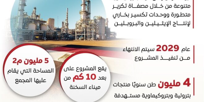في إطار حرص الدولة على تحقيق التحول الأخضر في صناعة البتروكيماويات، والاستدامة البيئية وخفض البصمة الكربونية ودعم توفير الطاقة وفقًا لاستراتيجية التنمية المستدامة ورؤية مصر 2030، يتم تنفيذ مجمع البحر الأحمر بالمنطقة الاقتصادية لمحور قناة السويس، والذي يقع على بعد 10 كم من ميناء السخنة، بهدف إنتاج مواد بتروكيماوية متنوعة من خلال مصفاة تكرير نفط متطورة ووحدات تكسير بخاري لإنتاج الإيثيلين والبروبلين.