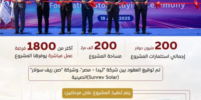 في إطار التوجه الوطني نحو تعزيز التحول إلى الاقتصاد الأخضر، ودعم الصناعات المرتبطة بالطاقة النظيفة، وتنفيذًا لرؤية مصر 2030 واستراتيجية التنمية المستدامة، تم توقيع عقد مشروع إنشاء مجمع صناعي متكامل لصناعة مستلزمات الطاقة الشمسية داخل المنطقة الصناعية بالعين السخنة تنفذه شركة “صن ريف سولار– Sunrev Solar” الصينية، مما يعكس ثقة كبرى الشركات العالمية في مناخ الاستثمار بالمنطقة الاقتصادية لقناة السويس، ويعزز توطين الصناعات المتقدمة وتكامل سلاسل إنتاج وتوريد مستلزمات الطاقة الشمسية، لتصبح سلسلة الإنتاج في مصر مكتملة من المواد الخام حتى المنتج النهائي.