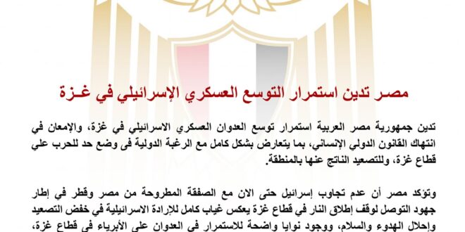 تدين جمهورية مصر العربية استمرار توسع العدوان العسكري الاسرائيلي في غزة، والإمعان في انتهاك القانون الدولي الإنساني، بما يتعارض بشكل كامل مع الرغبة الدولية فى وضع حد للحرب علي قطاع غزة، وللتصعيد الناتج عنها بالمنطقة.
