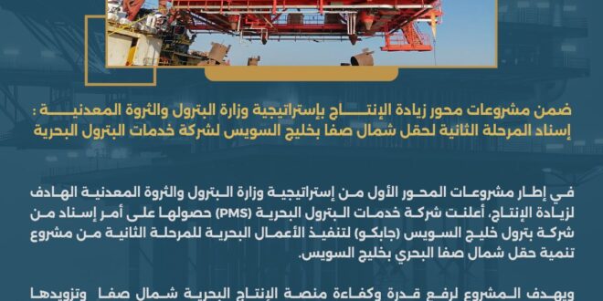 في إطار مشروعات المحور الأول من إستراتيجية وزارة البترول والثروة المعدنية الهادف لزيادة الإنتاج، أعلنت شركة خدمات البترول البحرية (PMS) حصولها على أمر إسناد من شركة بترول خليج السويس (جابكو) لتنفيذ الأعمال البحرية للمرحلة الثانية من مشروع تنمية حقل شمال صفا البحري بخليج السويس.