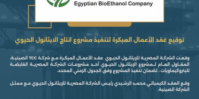 وقعت الشركة المصرية للإيثانول الحيوي عقد الأعمال المبكرة مع شركة TCC الصينية، المقاول العام لمشروع الإيثانول الحيوي أحد مشروعات الشركة المصرية القابضة للبتروكيماويات ، لضمان تنفيذ المشروع وفق الجدول الزمني المحدد.