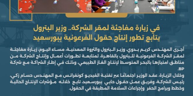 أجرى المهندس كريم بدوي، وزير البترول والثروة المعدنية، مساء اليوم، زيارة مفاجئة لمقر الشركة الفرعونية للبترول بالقاهرة، لمتابعة تطورات أعمال وإنتاج الشركة من مناطق امتيازها بالبحر المتوسط لإنتاج الغاز الطبيعي، وذلك في إطار الشراكة مع شركة BP.