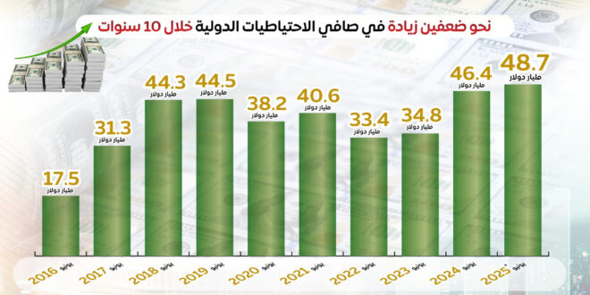 – صافي الاحتياطيات الدولية يحقق ضعفي مستوياته خلال 10 سنوات ويسجل 49.3 مليار دولار في أغسطس 2025