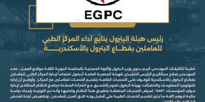 تنفيذا لتكليفات المهندس كريم بدوى وزير البترول والثروة المعدنية بالمتابعة الدورية لكافة مواقع العمل ، عقد المهندس صلاح عبدالكريم الرئيس التنفيذى للهيئة المصرية العامة للبترول اجتماعاً لإدارة المركز الطبى للعاملين بقطاع البترول بالأسكندرية للوقوف على التحديات الخاصة بتقديم الخدمات للعاملين عبر المركز ، وأوضح أن إدارة تكنولوجيا المعلومات والاتصالات بهيئة البترول تقوم بالتنسيق مع الشركة المنفذة لبرنامج النظام المتكامل لإدارة موارد المؤسسات “SAP” لعرض التحديات المتعلقة بتطبيق هذا النظام وتلافيها وأنه تم التوجيه بإعداد دراسة مالية لتوفير كافة ما يلزم لتقديم الخدمات الطبية على أفضل وجه كحق أصيل للعاملين ، وتخصيص لجنة لفحص الشكاوى والمخالفات .