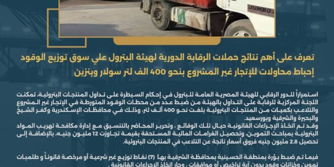 استمراراً للدور الرقابي للهيئة المصرية العامة للبترول في إحكام السيطرة على تداول المنتجات البترولية، تمكنت اللجنة المركزية للرقابة على التداول بالهيئة من ضبط عدد من محطات الوقود المتورطة في الإتجار غير المشروع والتلاعب بكميات من المنتجات البترولية بلغت نحو 400 ألف لتر، وذلك في محافظات الإسكندرية وكفر الشيخ والبحيرة والشرقية وبورسعيد.