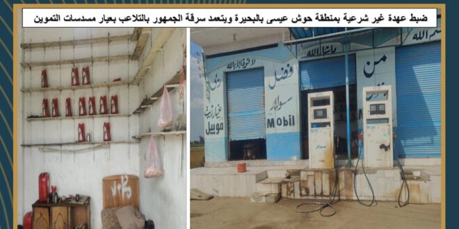 و في مواجهة أوكار التداول غير المشروع، تم ضبط عهدة غير شرعية بمنطقة حوش عيسى بمحافظة البحيرة بدون أي تراخيص أو موافقات، تقوم ببيع منتجات السولار والبنزين 80 والبنزين 92 دون أي وسائل تأمين للموقع، فضلاً عن التلاعب في عيار مسدسات التموين .