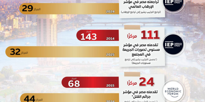 – 111 مركزًا تقدمتها مصر في مؤشر “تصورات الجريمة” الصادر عن معهد الاقتصاد والسلام بعد تراجع مستويات الجريمة بها