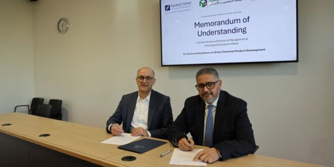 في خطوةٍ جديدة تعكس التزام بنك التعمير والإسكان بتطبيق أفضل الممارسات المستدامة، وتفعيلاً لاستراتيجية البنك (2025–2030) التي تضع الاستدامة محوراً رئيسياً في خططه المؤسسية، وقع البنك مذكرة تفاهم مع مدرسة فرانكفورت للإدارة والتمويل ، تحت رعاية الوكالة الألمانية للتعاون الدولي (GIZ)، وذلك ضمن مبادرة “بناء القدرات الخضراء” (GREET) المموَّلة من وزارة التعاون الاقتصادي والتنمية الألمانية (BMZ)، وتهدف هذه الشراكة إلى تطوير منتجات تمويلية خضراء مبتكرة وتعزيز قدرات البنك المؤسسية في مجال التمويل المستدام.