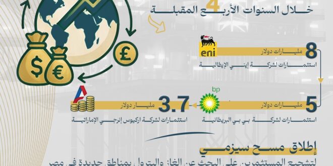 كما تم توقيع 33 اتفاقية جديدة للبحث عن البترول والغاز، باستثمارات حدها الأدنى 1.6 مليار دولار، إلى جانب طرح نحو 70 فرصة استثمارية جديدة في مناطق البحر المتوسط والأحمر والصحراء الغربية وخليج السويس والدلتا.