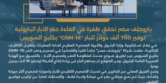 في إطار استراتيجية وزارة البترول والثروة المعدنية لتعظيم كفاءة العمليات وتقليل التكاليف الإنتاجية، حققت شركة “بتروجلف مصر” نجاحاً تقنياً واقتصادياً في تصميم وحفر البئر (GNN-16) بخليج السويس عبر تطبيق نموذج محدث لمنظومة الحفر وتصميم الآبار ، بالتنسيق مع الهيئة المصرية العامة للبترول، ومن المتوقع ان يساهم البئر فى زيادة إنتاج الشركة ليتجاوز 30 ألف برميل يومياً.