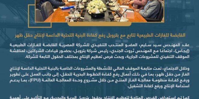 وخلال الاجتماع، تمت متابعة الموقف الحالي للأنشطة والمشروعات الخاصة بالبنية التحتية الداعمة لإنتاج الغاز من حقل ظهر، بما في ذلك أعمال رفع كفاءة الخطوط البحرية للحقل، إلى جانب العمل على تطوير ورفع كفاءة منظومة معالجة الغاز المنتج من خلال مشروع وحدة المعالجة العائمة (FPU)، بما يدعم استدامة الإنتاج ورفع كفاءة التشغيل.