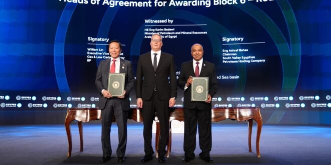 في إطار فعاليات اليوم الأول من مؤتمر ومعرض مصر الدولي للطاقة “إيجبس 2026”، شهد المهندس كريم بدوي، وزير البترول والثروة المعدنية، توقيع مذكرة المبادئ الأساسية لاتفاقية إسناد القطاع (6) بالبحر الأحمر، بين شركة جنوب الوادي المصرية القابضة للبترول وشركة “بي بي إكسبلوريشن (دلتا) ليمتد”.