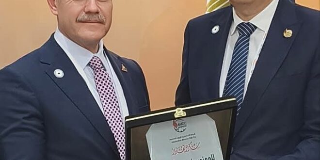 وفي ختام الاجتماع أهدى الكيميائي/ ماجد الكُردي درع تكريم للمهندس/ عمرو أسامة تقديرًا لجهود الشركة في تنفيذ مشروع زيادة السعات التخزينية بأموك والتعاون المثمر بين الجانبين.