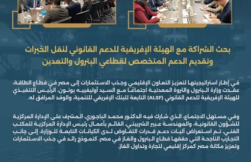 ومن جانبهم، أعرب وفد الهيئة الإفريقية للدعم القانوني عن استعدادهم لتقديم برامج دعم متكاملة تشمل الجوانب القانونية والفنية وبناء القدرات، مؤكدين اهتمامهم بتوسيع نطاق التعاون مع مصر في مختلف مجالات الصناعات الاستخراجية، باعتبارها من القطاعات الواعدة على مستوى القارة الإفريقية.